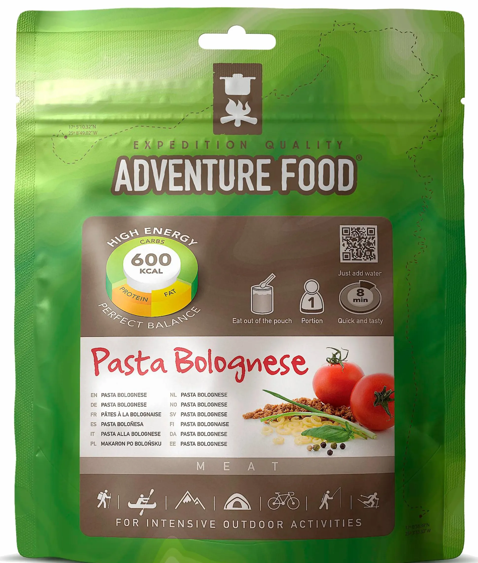 Adventure Food on laadukkaita pakastekuivattuja aterioita sisältävä sarja niille, jotka vaativat paljon sekä ravintosisällöltä että maukkaudelta. Sarjan ovat kehittäneet ammattilaisvuorikiipeilijät, jotka tietävät, mitä tarvitaan jaksamiseen retkillä esim. K2:lla ja Mount Everestillä. Valmistus: 1. Avaa pussi merkinnän kohdalta. Levitä pohjaosa auki. Poista ”hapenpoistaja”. 2. Lisää kuumaa vettä viivaan 22 asti (0,8 l). 3. Sekoita hyvin. 4. Sulje pussi. Anna vetäytyä 8 minuuttia. 5. Sekoita. 6. Valmis syötäväksi.