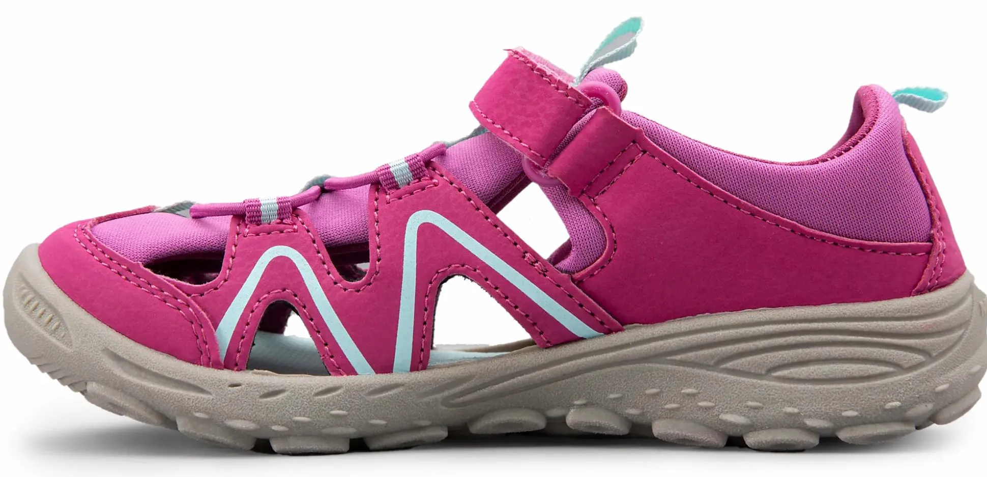 Kestävästä materiaalista valmistettu lasten sandaali, jossa on vedenkestävä päällinen ja nopeasti kuivuva vuori. Joustavat hihnat ja tarranauha helpottavat sandaalin pukemista ja riisumista, jotta pääset lähtemään nopeasti seuraavaan seikkailuun. Ulkopohja ei jätä jälkiä lattiaan, ja se on muotoiltu pitäväksi monille erilaisille alustoille.
