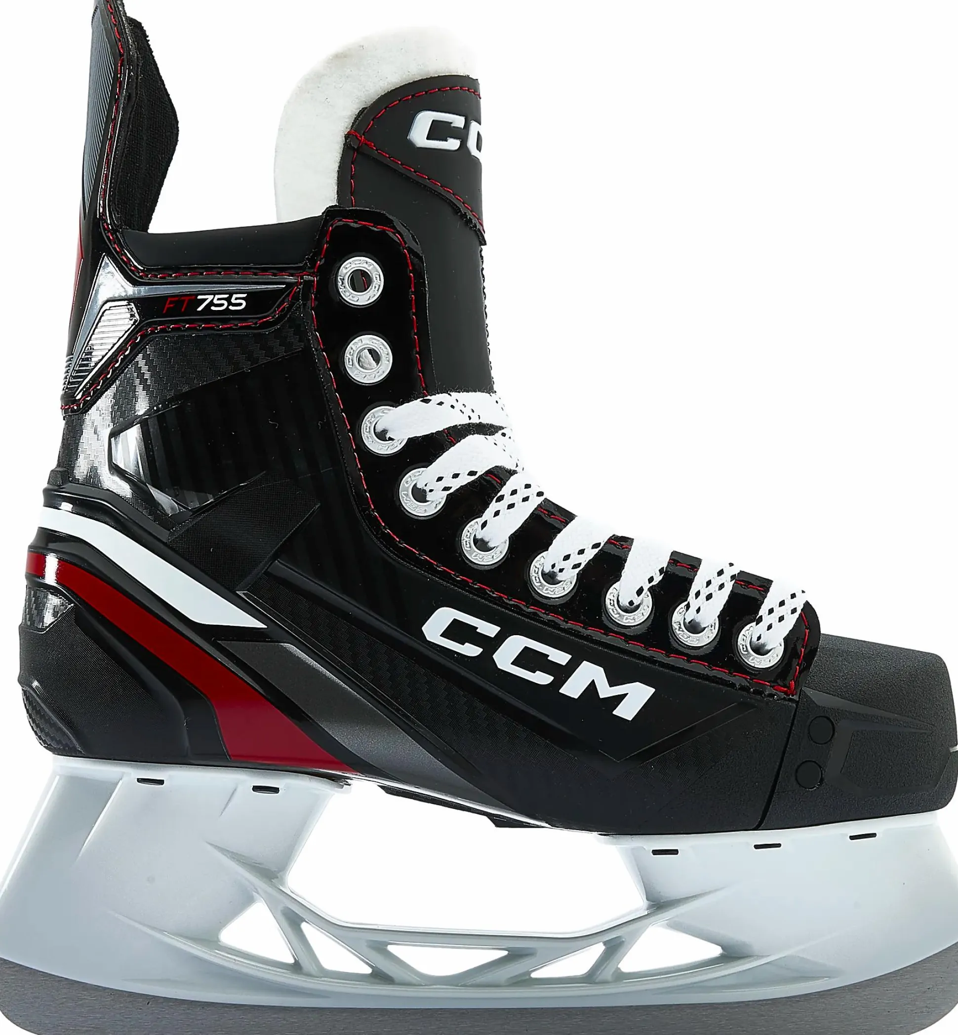 CCM SK 755 -jääkiekkoluistimet on suunniteltu pelaajille, jotka etsivät hyvää tasapainoa suorituskyvyn, mukavuuden ja kestävyyden välillä. Luistimet on kehitetty suoriutumaan jäällä, olipa kyseessä harjoitus tai ottelu. 2D-quarter hiilikuitukuvioidulla synteettisellä nahalla tarjoaa kevyen ja kestävän rakenteen ergonomisella istuvuudella, joka istuu tiukasti jalan ympärille ja tukee jokaista potkua. Sisäpuoli on vuorattu HD-mikrokuituvuorella ja EVA-kerroksella, mikä lisää mukavuutta ja antaa jalan ympärille mukautuvan tunteen. Luistimissa on myös ADPT-ankkatyynyt memoryfoam-materiaalista, jotka muotoutuvat jalan muotojen mukaan ja tarjoavat vakaan, tiukan istuvuuden. 7 mm paksu iltti, jossa on 3D-mesh-kerros, suojaa lacebite-ilmiöltä ja tarjoaa lisämukavuutta ja suojaa nilkan yli nauhoituksen aikana.